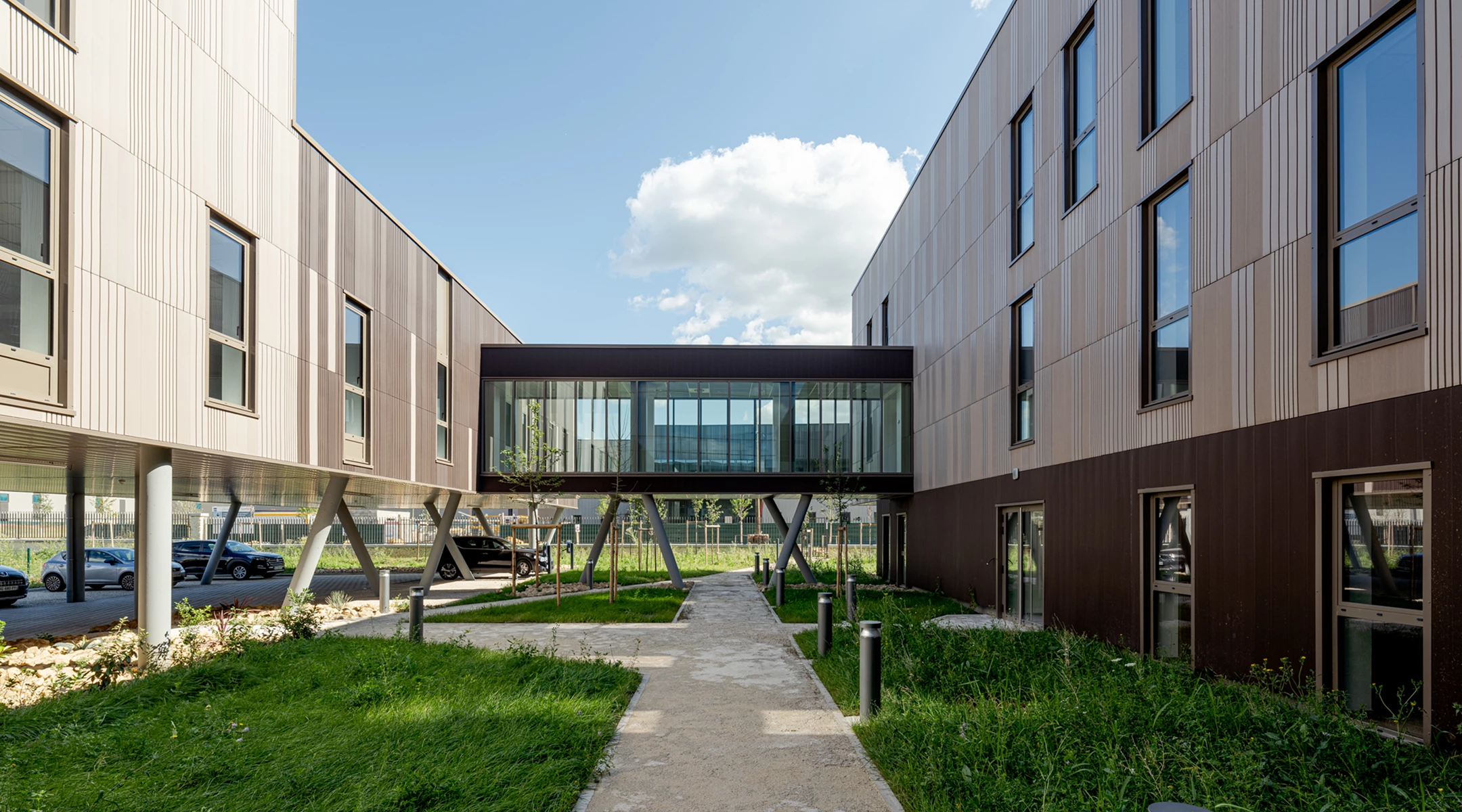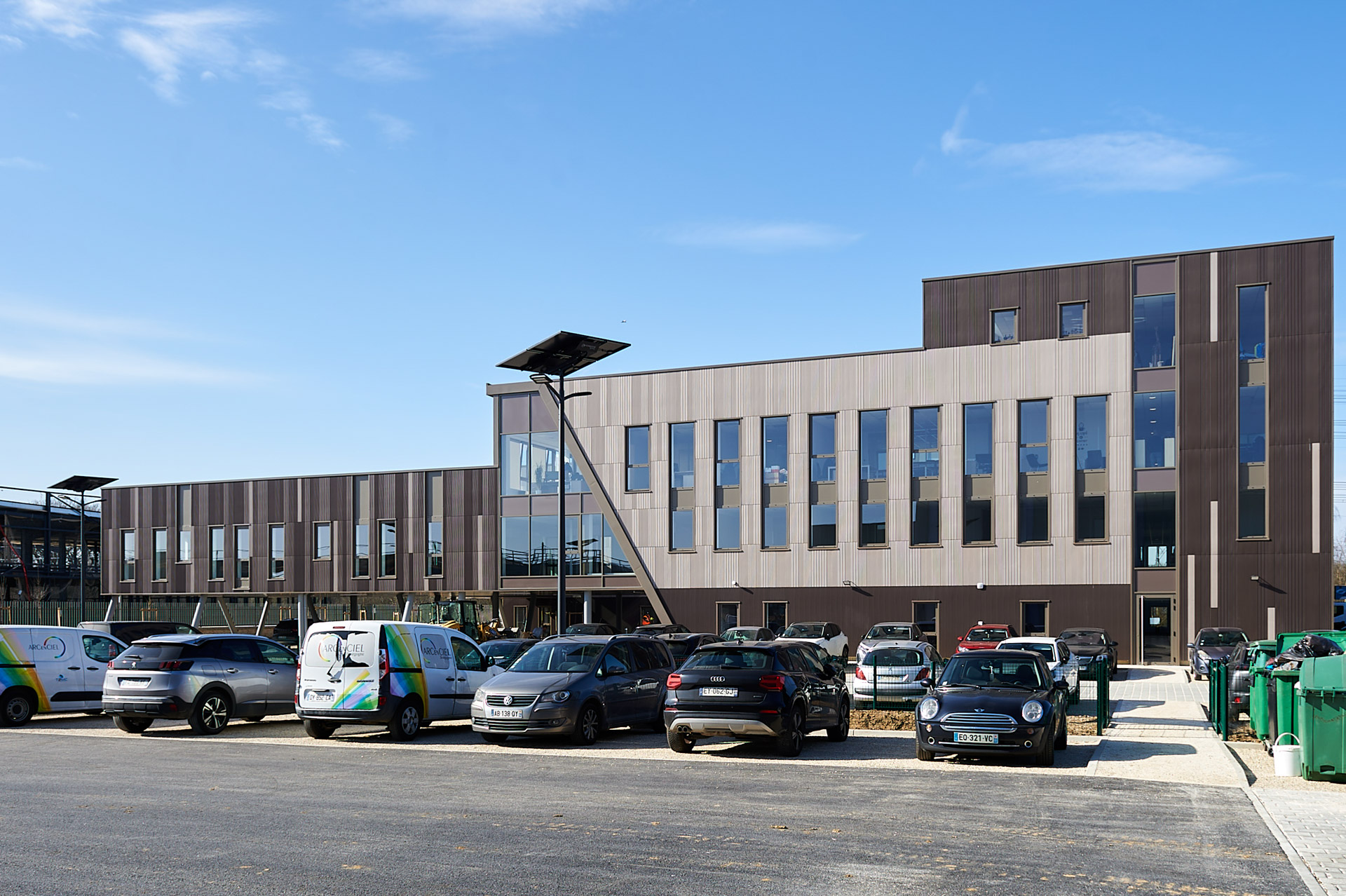 Un immeuble de bureaux conçu comme un signal d’entrée de la ZAC de l’amirault à croissy beaubourg, l’immeuble de bureaux comportant 4 niveaux de plancher s’inscrit dans une zone d’activités à vocation écologique. L’ensemble des eaux de voiries sont tamponnées par une chaussée réservoir constituée de matériaux recyclé, les eaux de voiries sont traitées par phytoremédiation, l’ensemble du volet paysager est réalisé pour améliorer la biodiversité ( prairie mélifère, Haie favorisant la nidification, mise en place de pierrier, etc)